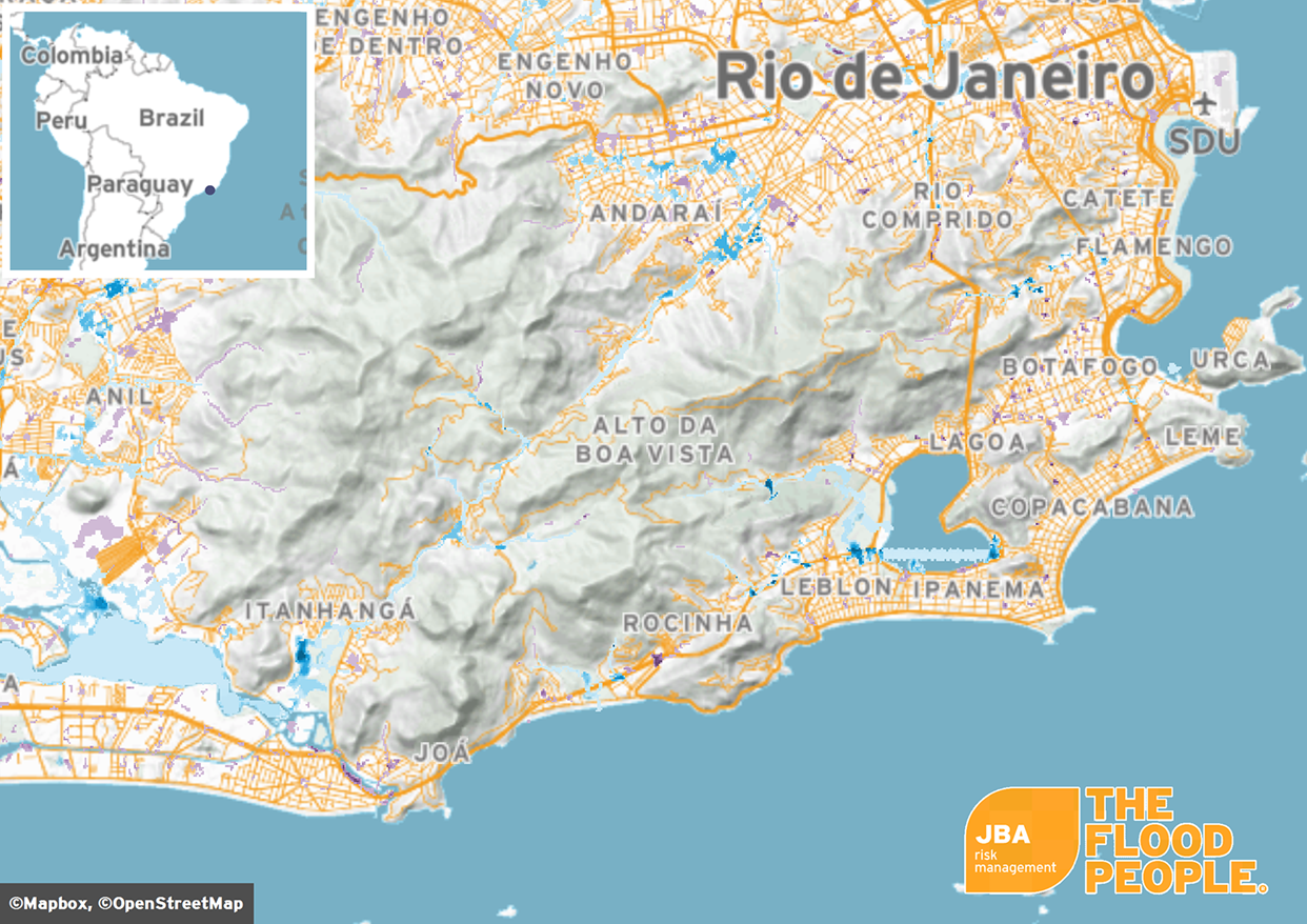 Figure 1: An extract of the JBA 1-in-20-year 30m Brazil River and Surface Water Flood Maps. The area illustrated is south of Rio de Janeiro city. Barra da Tijuca, Niemeyer Avenue, Jardim Botanico, Copacabana Beach, Humaita and Botafogo neighbourhoods were some of the areas affected in Rio de Janeiro based on reports by Reuters. (JBA Risk Management Limited™).