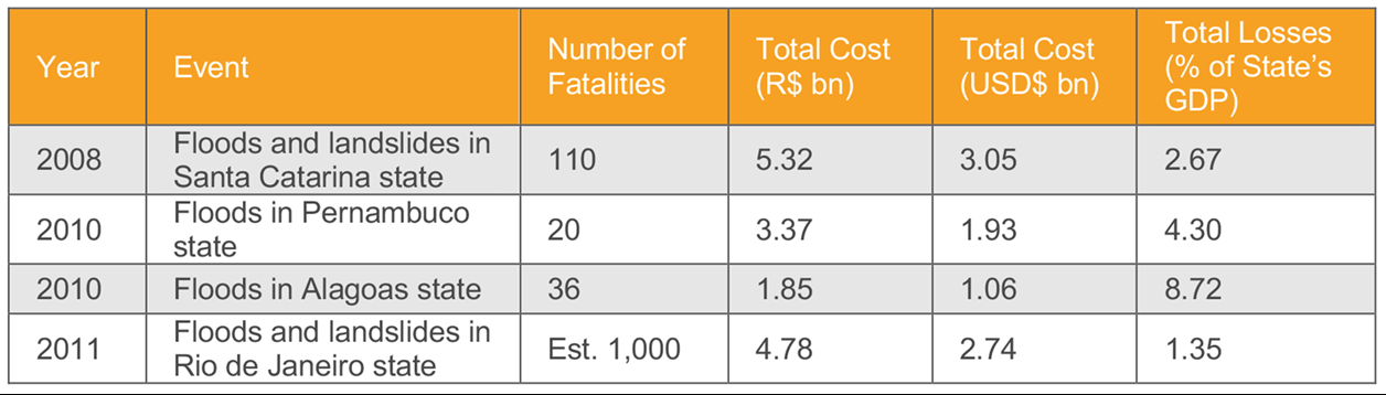 Table 2: Historical events and economic losses in Brazil (World Bank, 2014). The conversion between Brazilian Real to US Dollar is based on a historical record rate of 1 BRL to 0.573 USD on 1 January 2010 (X-Rates, 2019).