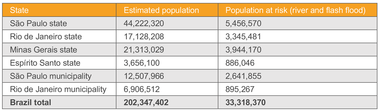 Table 1: Estimated population and proportion of people at risk of river and flash flood in various states of Brazil. The data were generated using a study conducted by Swiss Re (Swiss Re, 2011).