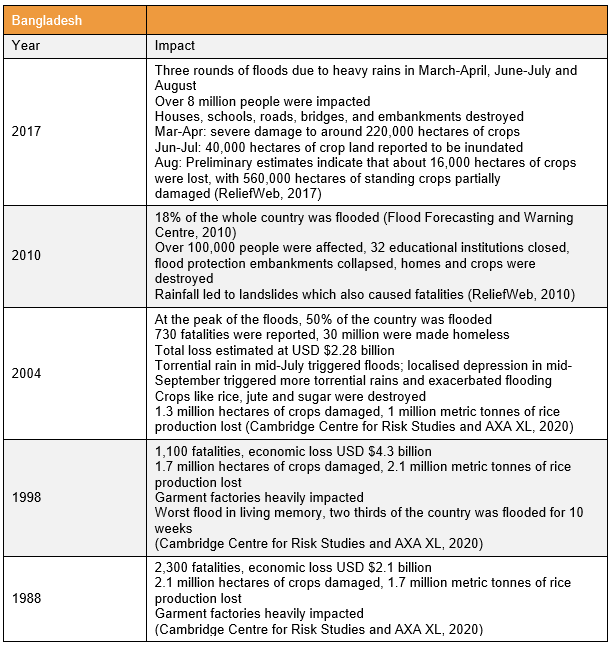 Cambridge Centre for Risk Studies and AXA XL, 2020. Disaster Recovery Case Studies: Bangladesh Floods 2004. Cambridge Centre for Risk Studies at the University of Cambridge Judge Business School. [online] Available at: https://axaxl.com/-/media/axaxl/files/pdfs/campaign/reinsurance-outlook/downloads/axa-xl_re_disaster-recovery_bangladesh-floods_uccrs.pdf?sc_lang=en&hash=8C1331CF6A16DBB0049B24C3A68EA5B3#:~:text=The%202004%20floods%20lasted%20from,floods%20had%20severe%20socioeconomic%20impacts. [Accessed 7 June 2022]