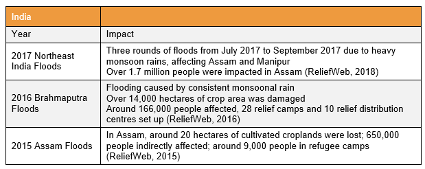 Over 60 people are known to have lost their lives in flooding across several provinces in eastern India, in May. The weather system also affected much of Bangladesh, causing damage to agricultural land and potentially leading to food shortages which may affect the wider region. This all happened in advance of the monsoon season, which was bringing further flood damage to the region as this report was being compiled.