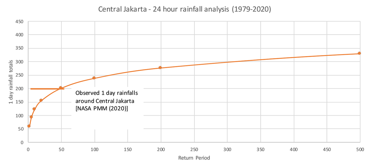 As Figure 2 highlights, though more extreme localised rainfall was recorded in East Jakarta, data observed from NASA PMM over Greater Jakarta in a 24-hour period estimates precipitation ranged between 189-196mm. Comparing these estimates to the 41-year record (1979-2020) of rainfall in Central Jakarta (NOAA CDO, 2020) suggests a return period of around 50 years for the January floods.