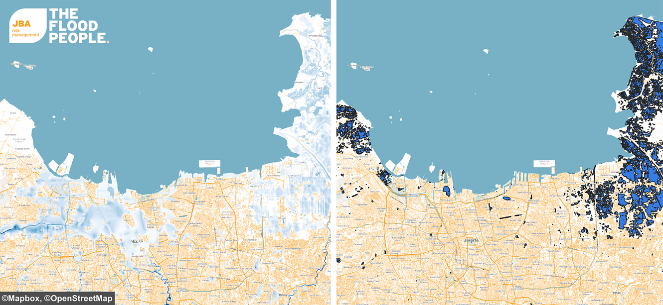 Figure 3: JBA’s 1-in-20-year Indonesia 30m river flood map showing Jakarta and the surrounding area (left) (JBA Risk Management Limited™) compared to satellite-detected surface water in Banten, Jakarta and Jawa Barat Province of Indonesia as observed from Sentinel-1 imagery acquired on 2 January 2020 (right) (Source: unitar.org). It is worth noting from the above comparison that the earth observation data does not appear to capture floodwater within urban areas. This flooding is captured within JBA’s flood map, which can be seen through the flood extent in Jakarta.