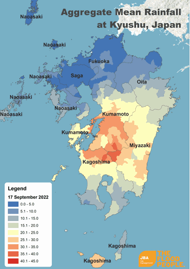 Figure 2: Mean daily rainfall accumulation (in mm) over municipalities of Kyushu Island between 17 and 19 September 2022. Data source: NASA GPM (2022), graphic produced by JBA (2022).