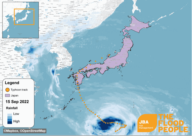 Figure 1: Satellite-observed rainfall animation showing Typhoon Nanmadol’s path between 15 and 20 September 2022. Rainfall data source: NASA GPM, 2022. Typhoon Nanmadol track data source: IBTrACS, 2022. Video produced by JBA Risk Management, 2022.