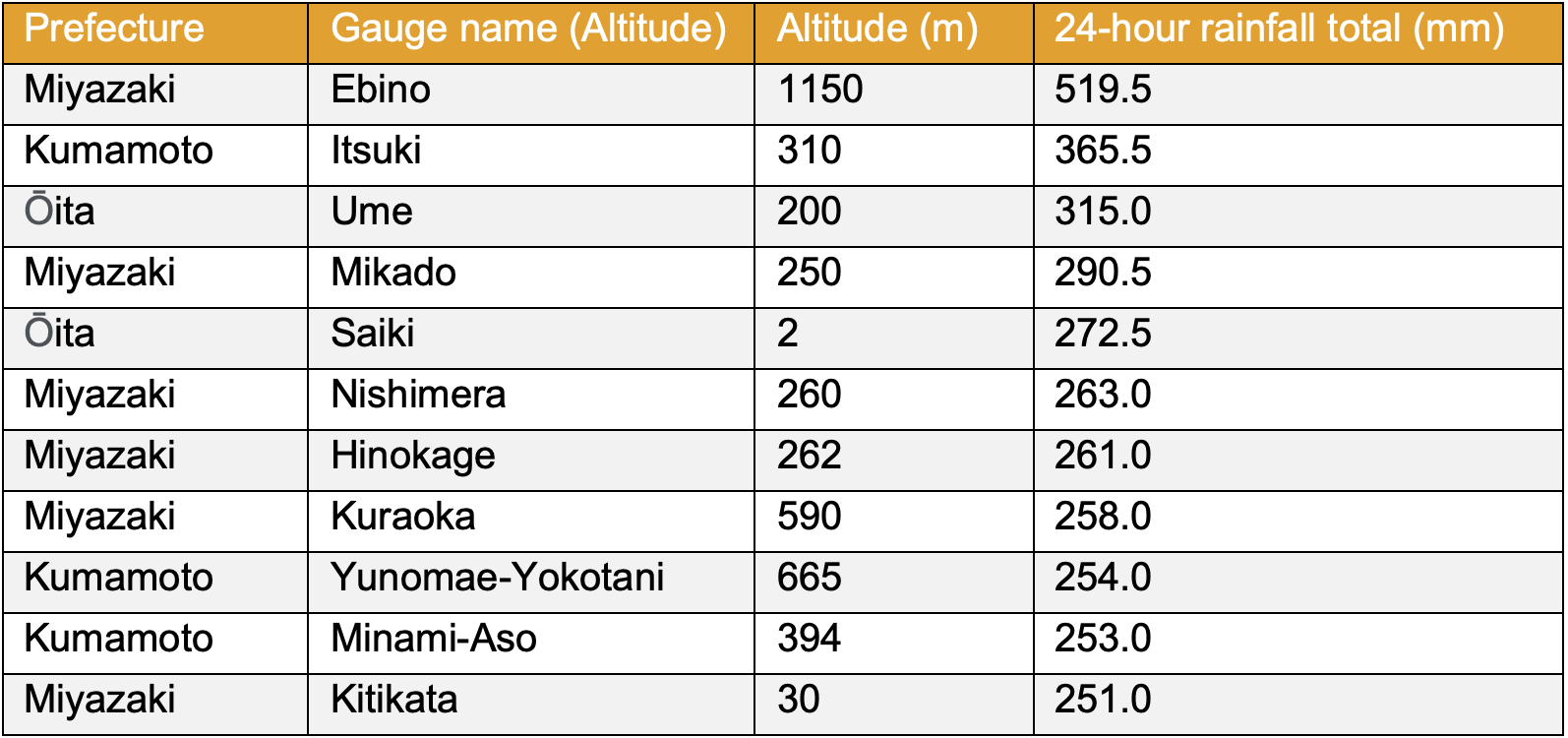 Table 3: 24-hour recorded precipitation at various locations on Kyushu Island, recorded between 18:00 JST 18 September to 18:00 19 September. Source: JMA, 2022b.