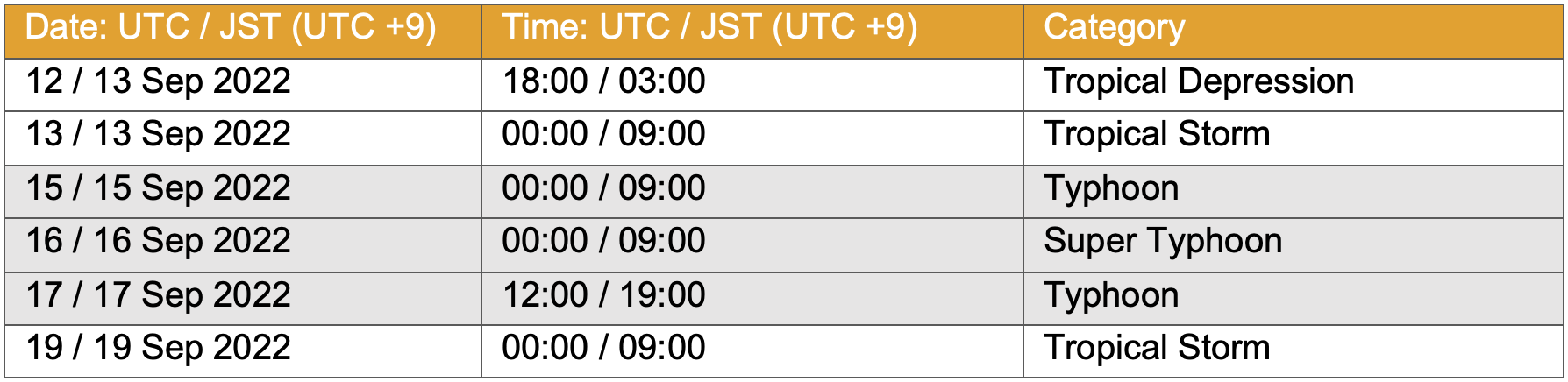 Table 1: Development of Typhoon Nanmadol (Source: Wunderground, 2022). Dates and times are given in both UTC and local Japan Standard Time (JST).