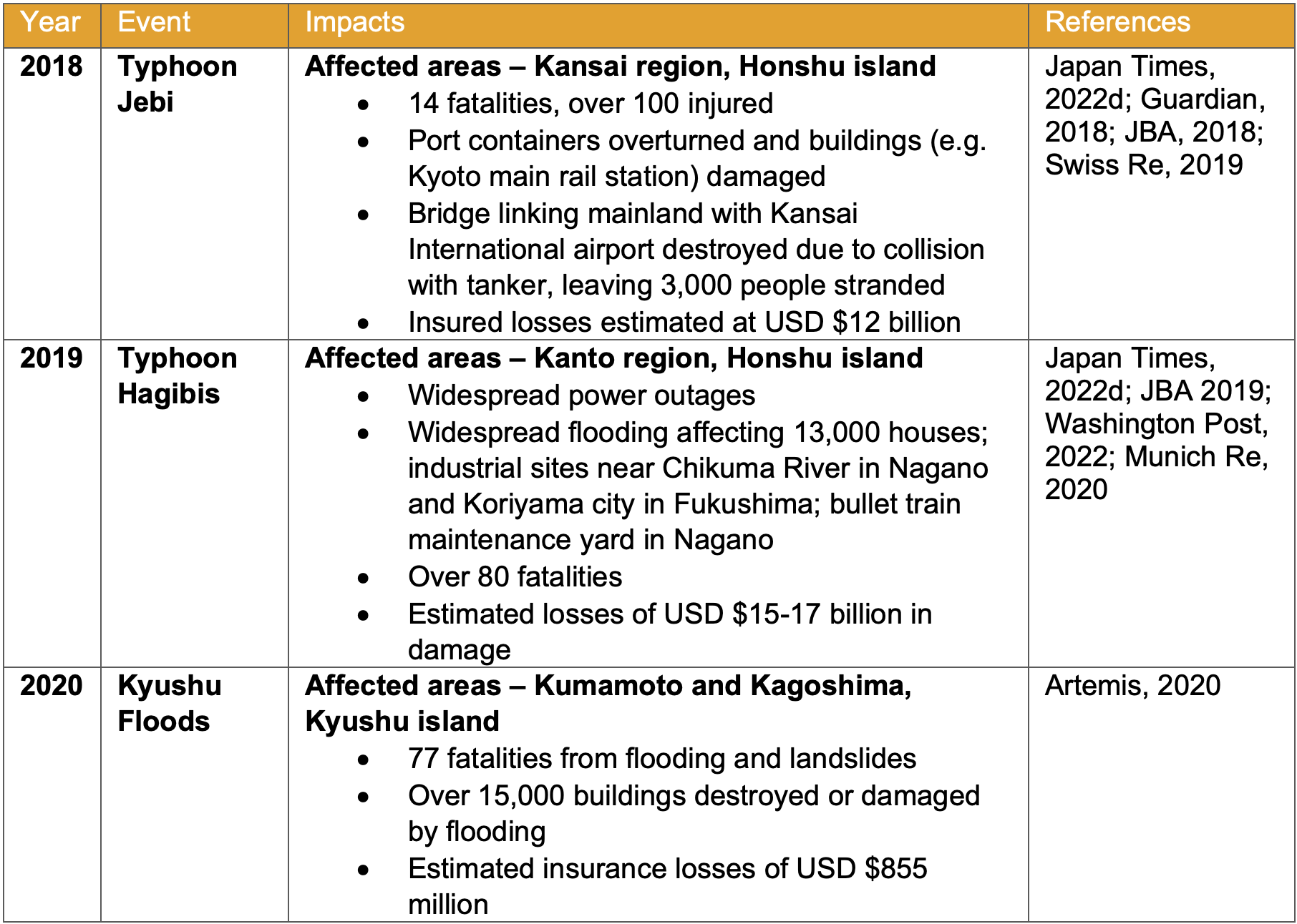 Artemis, 2020. 2020 Kyushu rain/flood & Japan typhoon Haishen losses near US $1.7bn. [online] Available at: https://www.artemis.bm/news/2020-kyushu-rain-flood-japan-typhoon-haishen-losses-near-us-1-7bn/. [Accessed 26 September 2022]