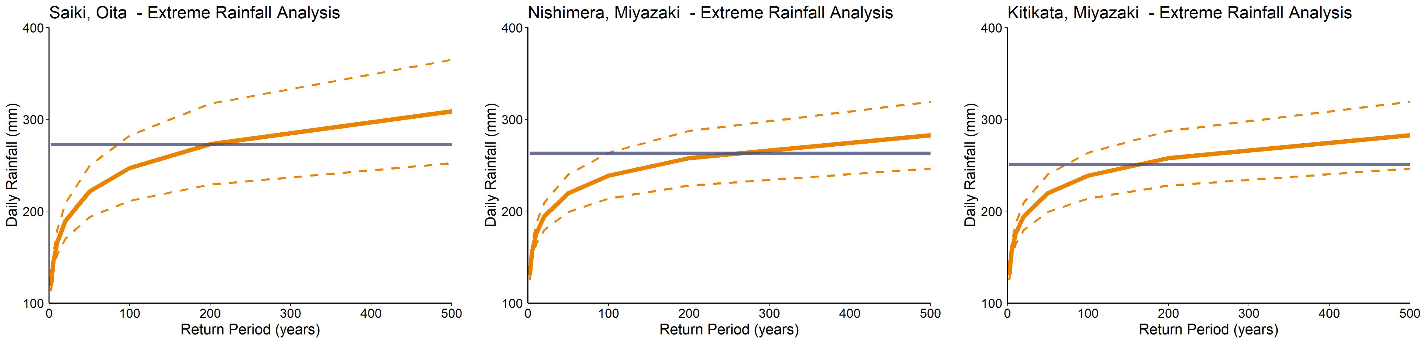 Figures 3, 4 and 5: Estimated extreme rainfall return periods at (left) Saiki, (middle) Nishimera and (right) Kitikata on Kyushu Island, based on NOAA CPC gridded climate data. Rainfall totals recorded between 18 September 18:00 JST and 19 September 18:00 JST are shown in context by the blue horizontal lines. CPC Global Unified Gauge-Based Analysis of Daily Precipitation data provided by the NOAA PSL, Boulder, Colorado, USA, from their website at https://psl.noaa.gov.