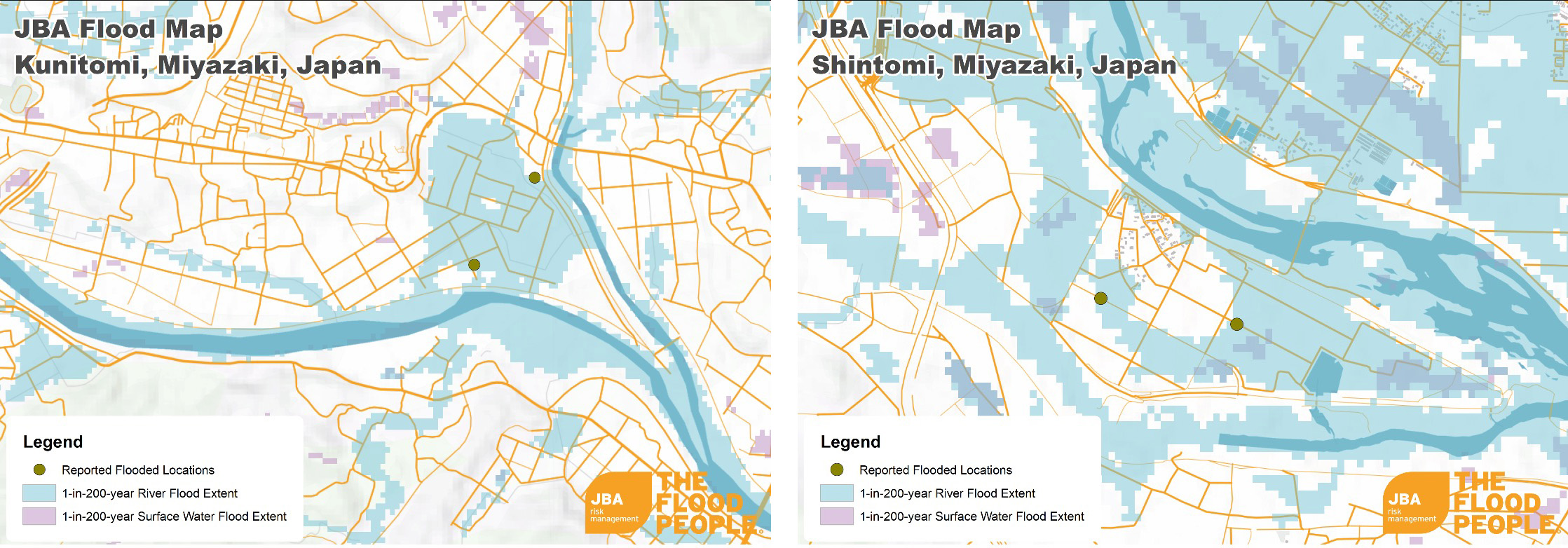 Figures 6 and 7: JBA’s river (blue) and surface water (purple) flood hazard maps showing flood extents for a 1-in-200-year event. Reported flood locations in Miyazaki Prefecture are shown in context (green circles) at Kunitomi, Higashimorokata District (Figure 6) and Shintomi, Kotu District (Figure 7).