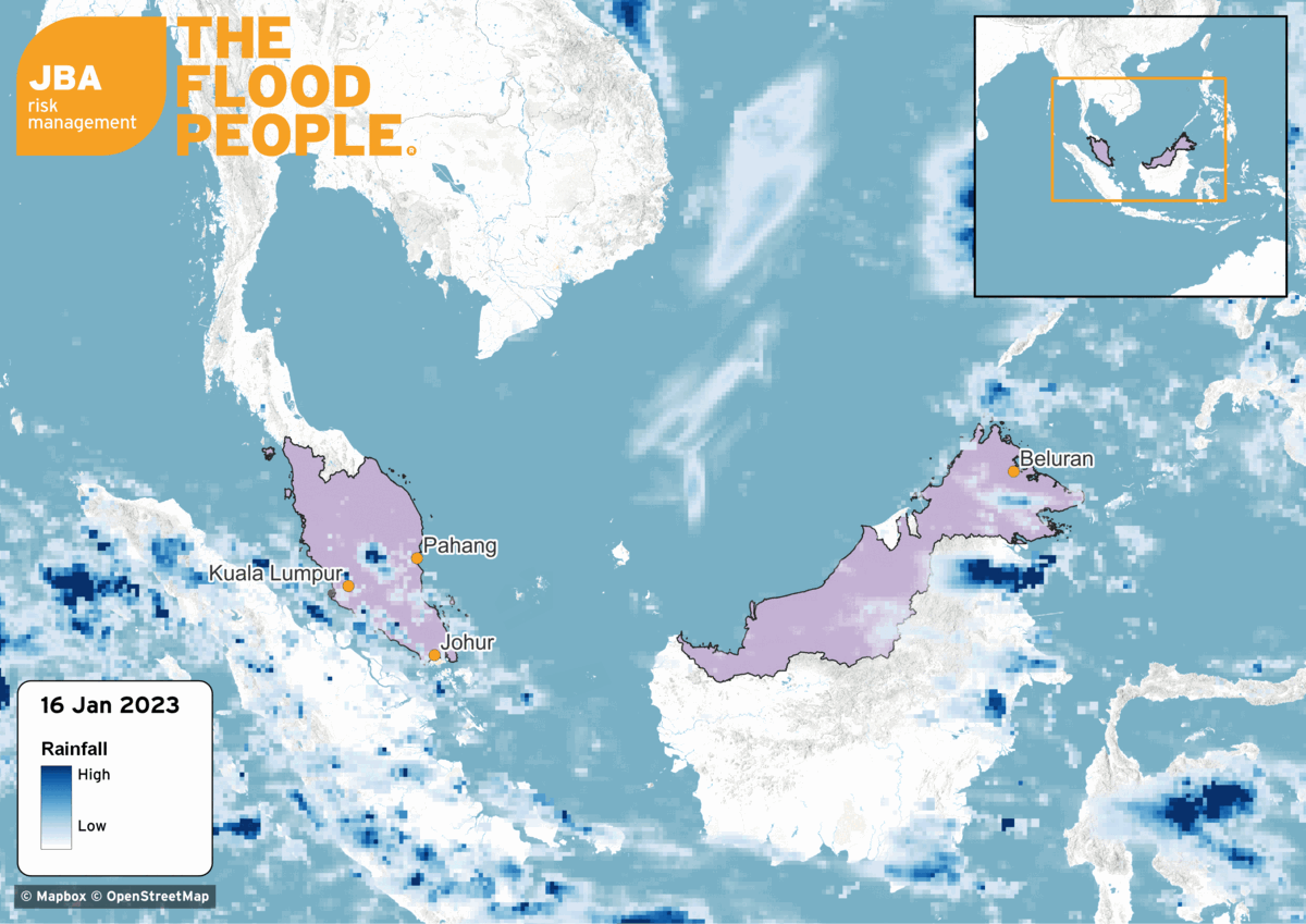 In the most recent event, both the peninsular areas and the regions of Borneo Island saw extreme rainfall and widespread flooding, starting on 24 January 2023 (ReliefWeb, 2023a). Affected areas include Batu Pahat, Kota Tinggi, Kluang, Lahad Datu, Pitas, Mersing, Rompin, and Segamat (ReliefWeb, 2023b).