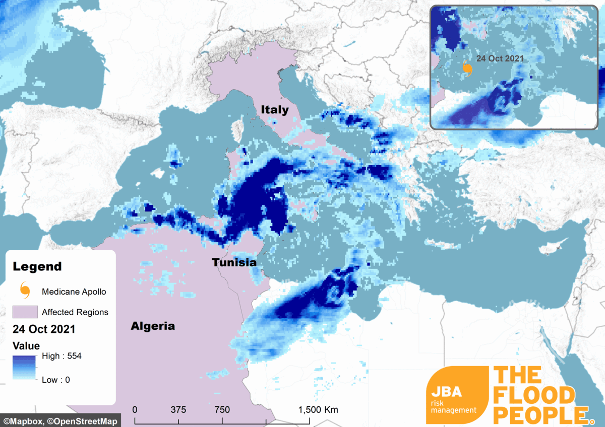 From 24-25 October 2021 a tropical-like cyclone, named ‘Medicane Apollo’, formed in the Mediterranean and caused significant flooding in Sicily, southern Italy, Algeria, Tunisia, and Libya (1, EUMETSAT, 2021).