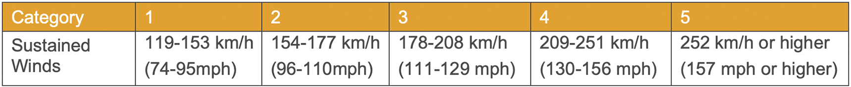 Table 1: Saffir-Simpson hurricane wind scale showing maximum sustained wind speed per category.