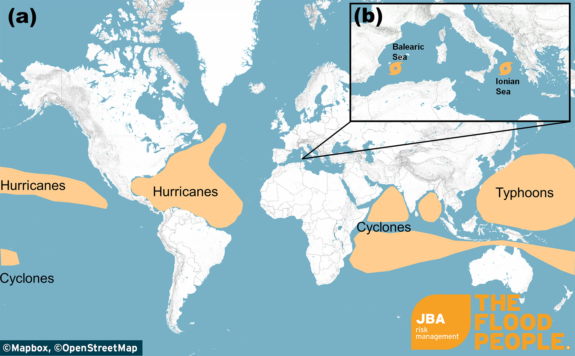 Figure 2: (a) Map of typical tropical cyclone locations and different geographical naming conventions; (b) focused map of the Mediterranean, with locations of typical medicane formation depicted by the orange symbols.