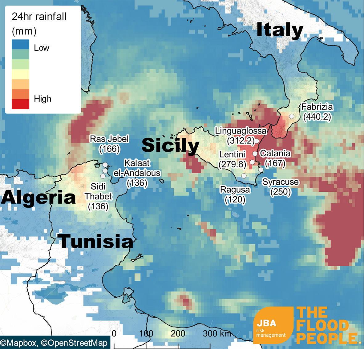 Figure 3 shows the highest recorded rainfall (mm) within a 24-hour period during the event in the central Mediterranean.