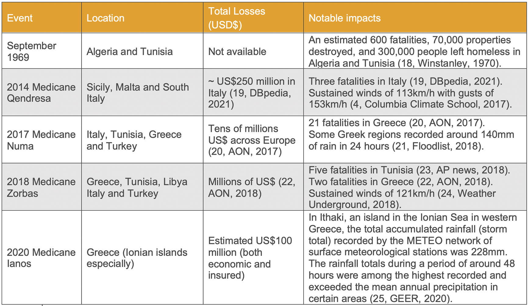 Table 2: Historical events and reported losses for medicane events in the Mediterranean.