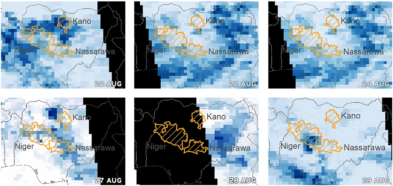Pictured Above: Estimated rainfall across Nigeria measured in millimetres (mm). The darkest shade of blue seen on the map represents 30mm of rainfall over a day and white represents 0mm. The affected states are highlighted in orange. These states received some rainfall before 27 August 2018. Continuous and heavy rainfall on 27 August 2018 resulted in flooding in Kano, whereas rainfall between 28–29 August 2018 triggered flooding in Niger and Nassarawa. (Data Source: NASA EOSDIS Worldview; GES DISC – AIRS2UP_NRT: AIRS/Aqua L Near Real Time Support Retrieval V006; GES DISC – Near Real Time Data).