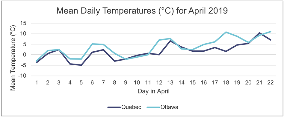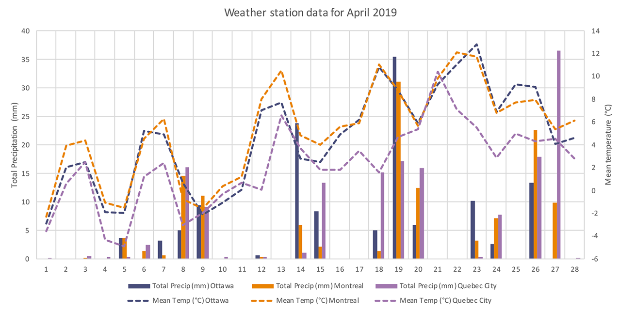Figure 2: Graph shows the average daily temperature from gauges at Quebec City and Ottawa International Airports. Temperatures have been seen to slowly increase over April, leading to increased thawing of snowpacks. This, coupled with moderate rainfall, has led to significant flooding in the Quebec region. Data source: Government of Canada.