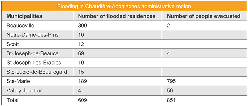 Figure 1: Table showing the number of properties flooded and the known number of people evacuated from the Chaudière-Appalaches administrative region in Quebec. Source: Urgence Québec.