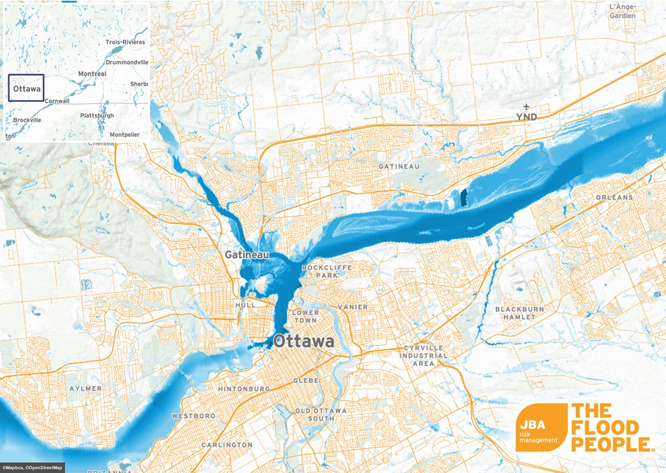 Figure 2: An extract of the JBA Canada 30m flood footprint. The area illustrated is Ottawa in Ontario, Canada. Observed depths around Hull, the central district of the city of Gatineau, are exceeding records previously set by similar flooding in 2017. (JBA Risk Management Limited™).
