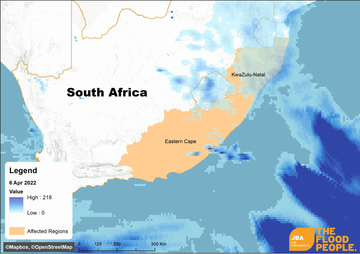 Figure 1: Satellite observed rainfall animation over South Africa from 6 to 21 April 2022. Data source: NASA GPM, 2022 (video produced by JBA Risk Management, 2022).