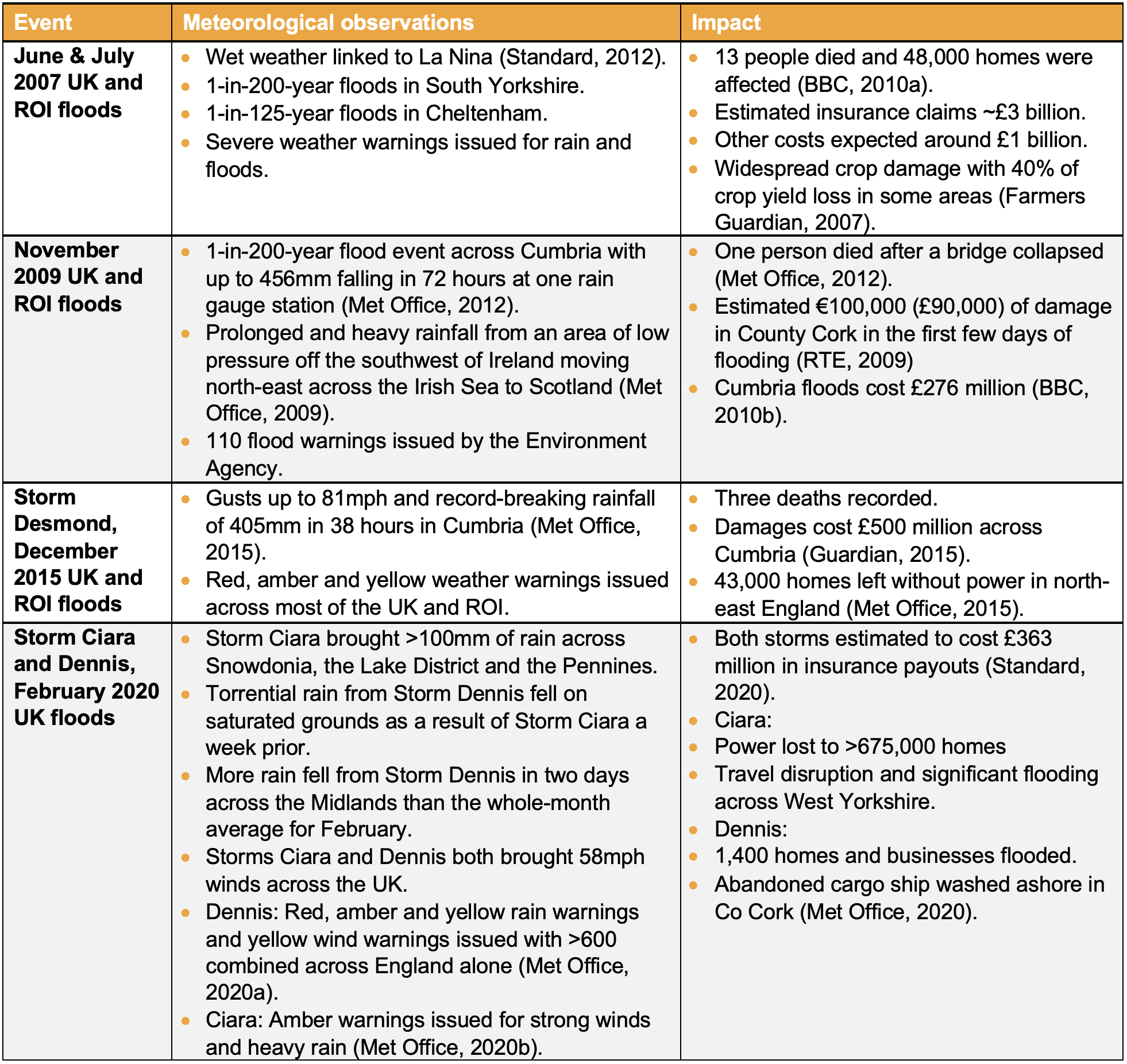 The UK and Ireland have a long history of extreme weather events and named storms resulting in severe weather warnings. Significant historic events which each resulted in disastrous flooding across the countries are listed below.