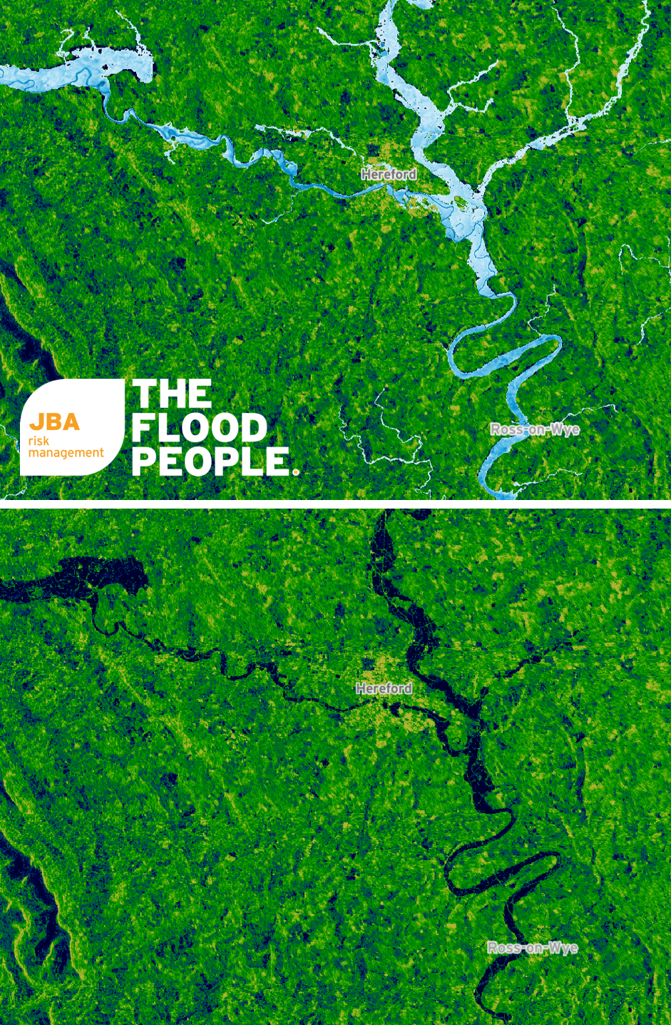 (Above) Comparison of JBA’s flood event footprint (top) and ESA Sentinel-1 imagery 17 February 2020 (bottom) for Hereford, Herefordshire. (Source: Sentinel Hub EO Browser)