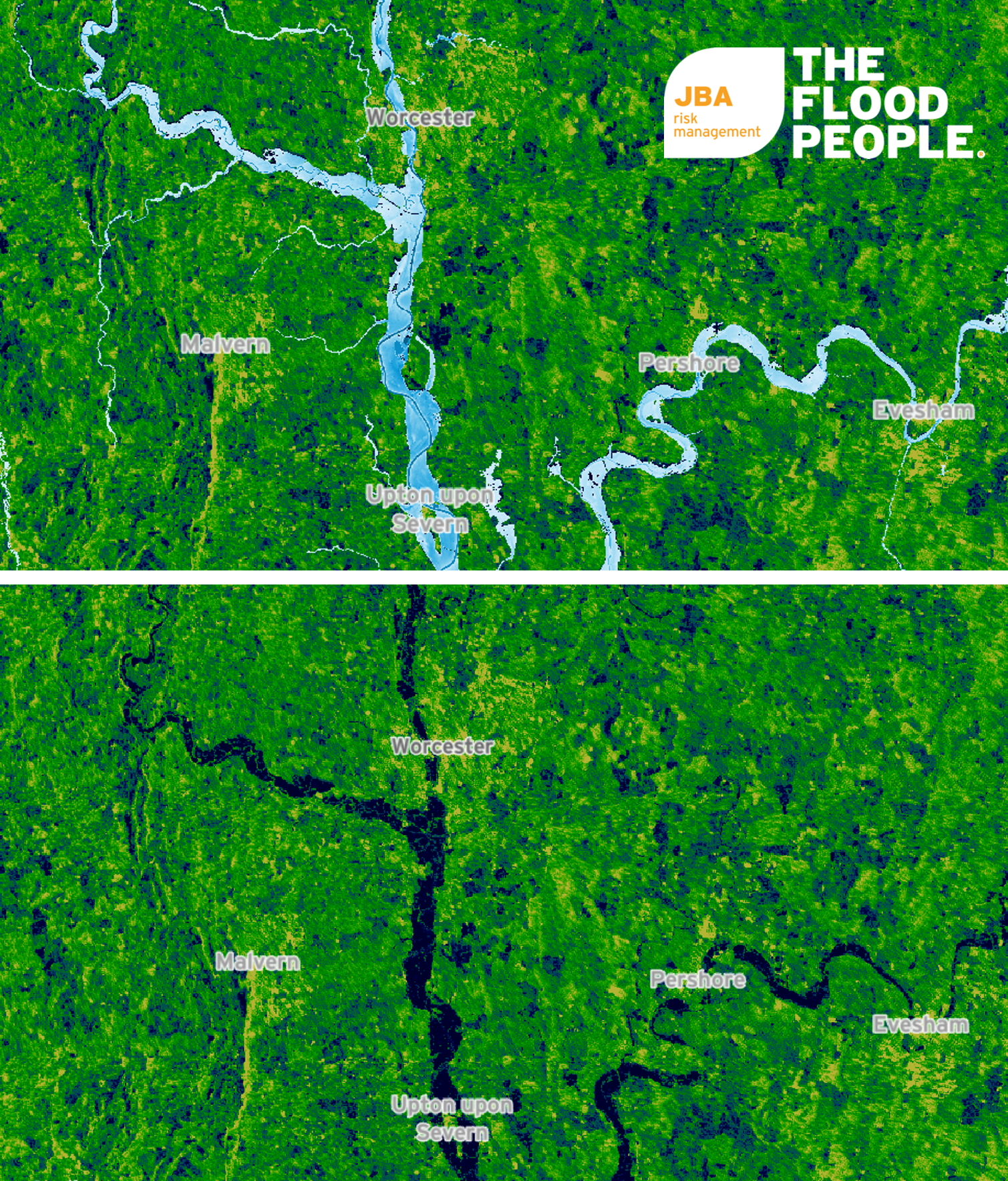 (Above) Comparison of JBA’s flood event footprint (top) and ESA Sentinel-1 imagery 17 February 2020 (bottom) for Upton-upon-Severn, Worcestershire. (Source: Sentinel Hub EO Browser)