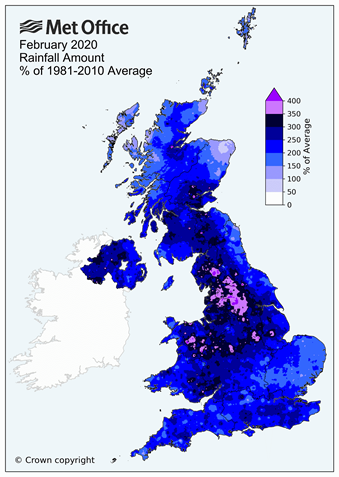 (Pictured right) February 2020 rainfall total as % of long-term average. (Source: Met Office)