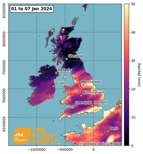 Figure 1 highlights rainfall accumulation over the first seven days of 2024. As shown, most of the extreme accumulation is concentrated along the coastal areas of England and Wales. The Midlands, as well as areas of Wiltshire and Gloucestershire, received high rainfall accumulation over the seven-day period. The River Trent catchment area, that runs through Birmingham, Leicestershire and Nottinghamshire, received particularly extreme accumulations, and this is reflected in the high impact flooding seen in these areas.