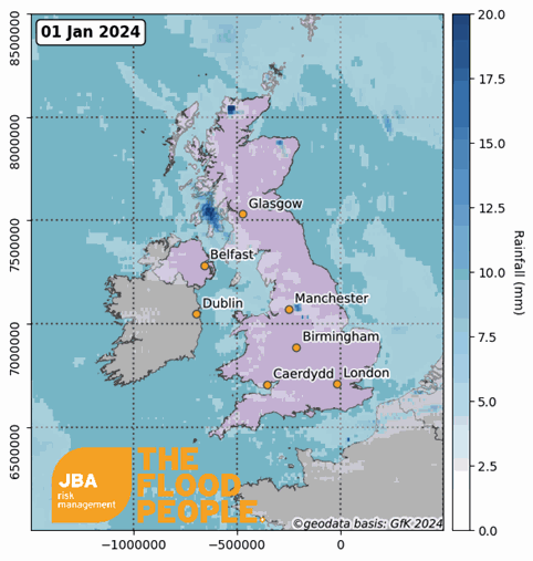 Figure 1: (Left) 7-day accumulated rainfall totals from 1 to 7 January 2024. Rainfall data source: NASA GPM, 2024. (Right) Satellite-observed rainfall animation showing Storm Henk’s coverage between 01 and 06 January 2024. Rainfall data source: NASA GPM 3-hour rainfall accumulation (2024a). Animation produced by JBA Risk Management (2024).