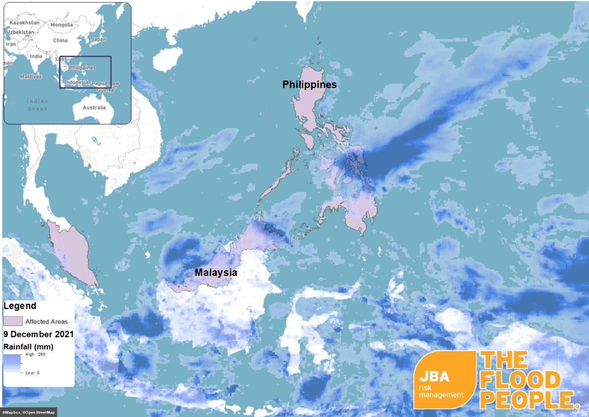Figure 3: Satellite-observed rain animation from 9 to 22 December in the South China Sea and West Pacific Ocean. Data source NASA GPM, 2021 (video produced by JBA Risk Management, 2021).
