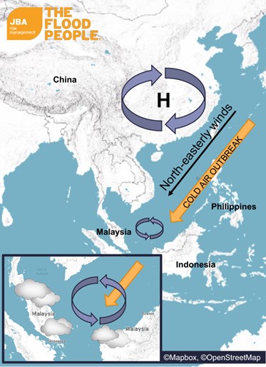 The South-east Asian region experiences two wet seasons annually (Tan, 2021): the South-west and the North-east monsoons, which occur May-September and November-March respectively (MET Malaysia, 2019). The Malaysian floods of December 2021 are linked to the North-east Monsoon, where cold north-easterly winds carry moisture-laden air across the South China Sea (SCS) towards Malaysia.