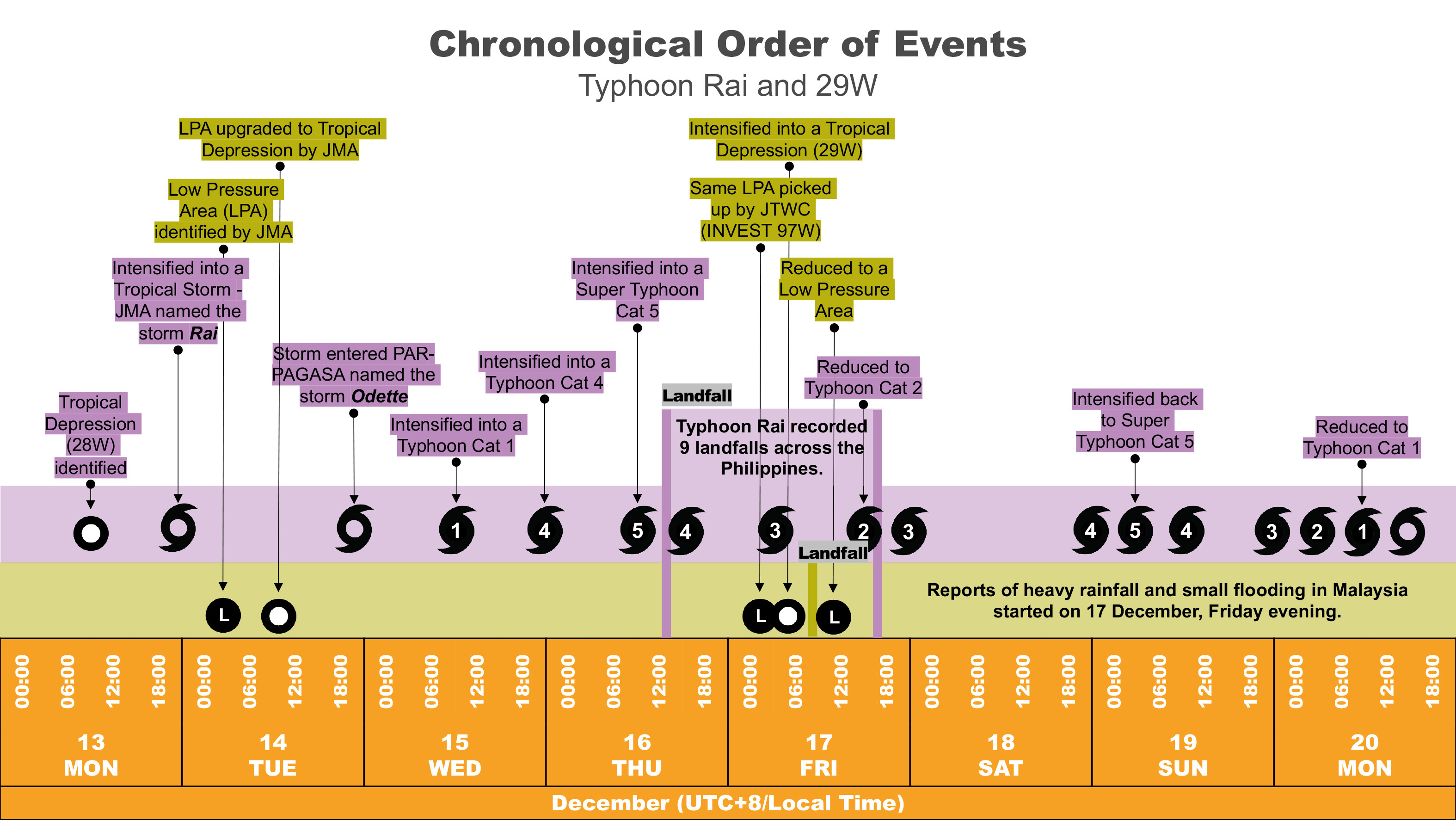 An interesting feature of Typhoon Rai is its simultaneous occurrence with flooding in Malaysia. These floods have been attributed to the interaction between: (1) the seasonal North-east Monsoon; (2) a low-pressure weather system (named Tropical Depression 29W); and (3) Typhoon Rai (Channel News Asia, 2021a).