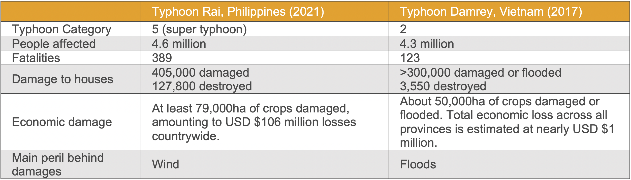 Table 3: Comparison of losses seen in the Philippines due to Typhoon Rai and in Vietnam due to Typhoon Damrey. Sources: Dan Tri (2017); Sai Gon Giai Phong Online (2017); Reinsurance News (2017); ReliefWeb (2017).