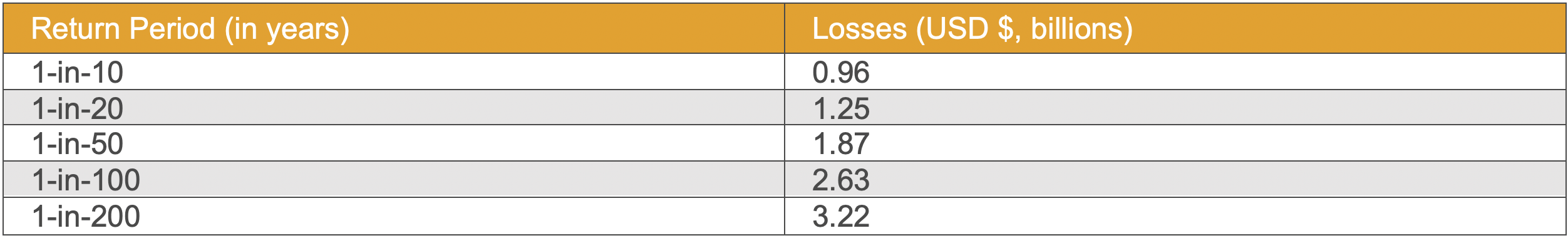 Table 2: Estimated economic losses for Malaysia from combined river and surface water flood for a range of return periods generated by JBA’s probabilistic modelling. Source: JBA Risk Management Ltd, 2021.