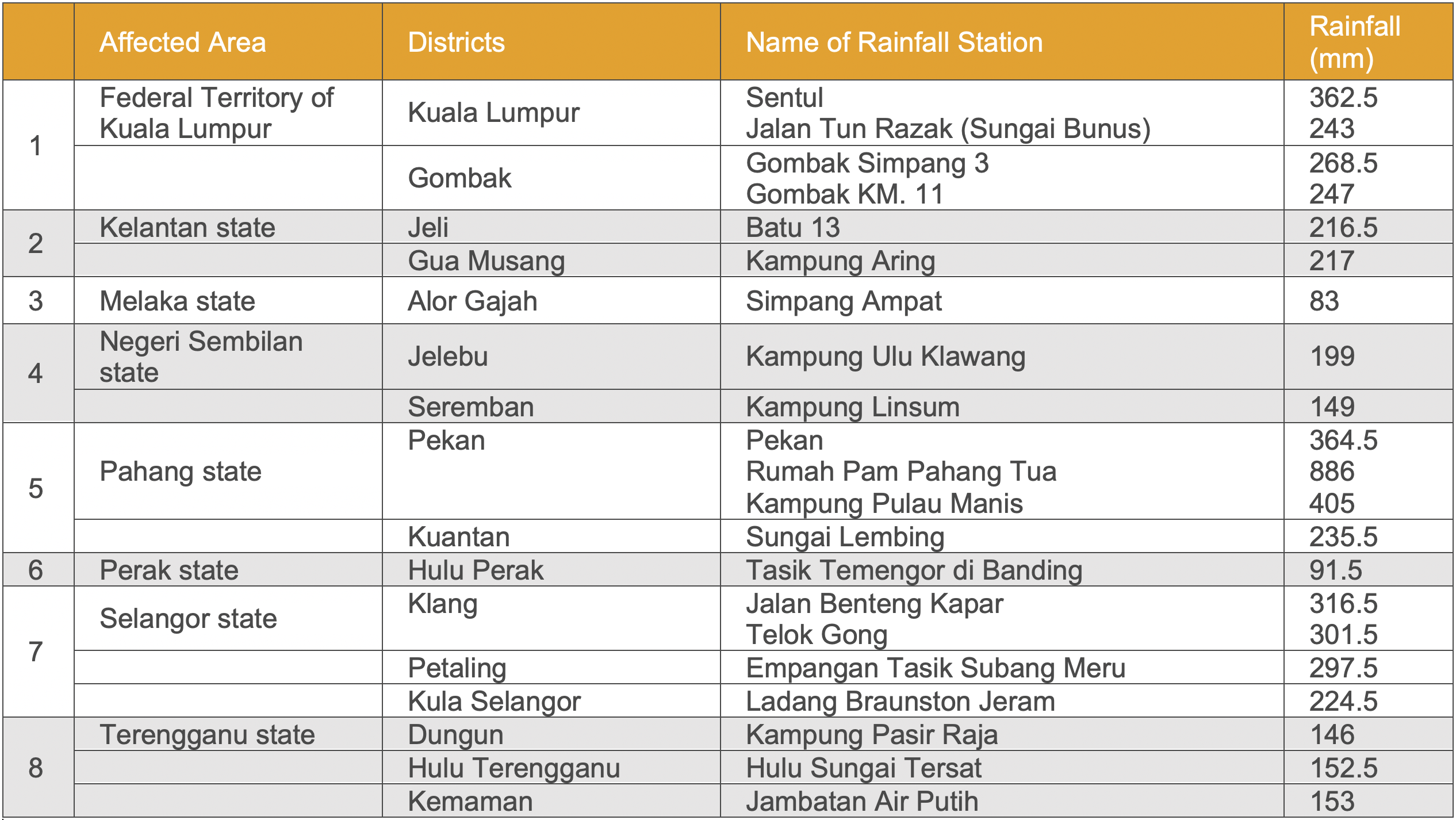 Table 1: Reported daily rainfall values (in mm) across affected states on the Malaysian Peninsula between 17 and 18 December 2021 (MEWA, 2021).