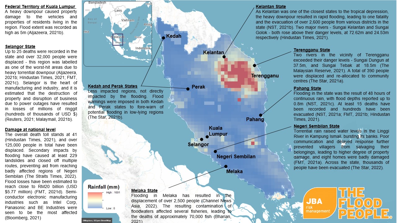 With over 36 hours of continuous heavy rain from 17 December, the Malaysian meteorological department reported that accumulated rainfall across the two days was equivalent to the average monthly rainfall in Malaysia; the country’s Environment and Water Ministry have retrospectively identified this as a 1-in-100-year event (The Straits Times, 2021).