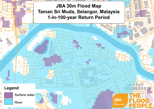 Figure 5 shows the simulated inundation across a town in Selangor state where flooding was observed, according to JBA RML’s 1-in-100-year river (fluvial) and surface water (pluvial) flood maps.