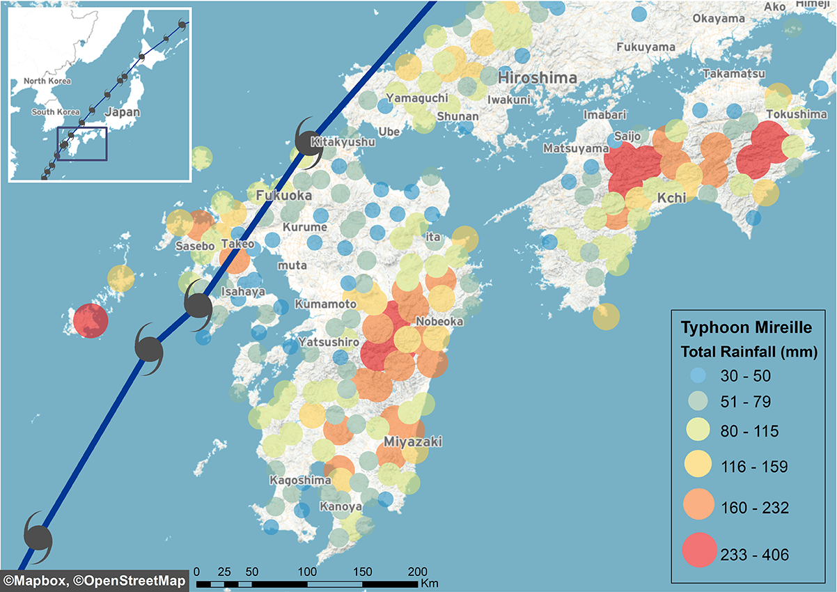 Figure 4: Total rainfall accumulation during Typhoon Mireille, which made landfall near Nagasaki in the south-west of Japan on 27 September 1991. South of Japan and Hokkaido Island received the greatest amount of rainfall as the Typhoon made landfall first near Fukuoka and for a second time in Hokkaido (please refer to insert).(Data source: National Institute of Informatics, 2019) (JBA Risk Management Limited™)