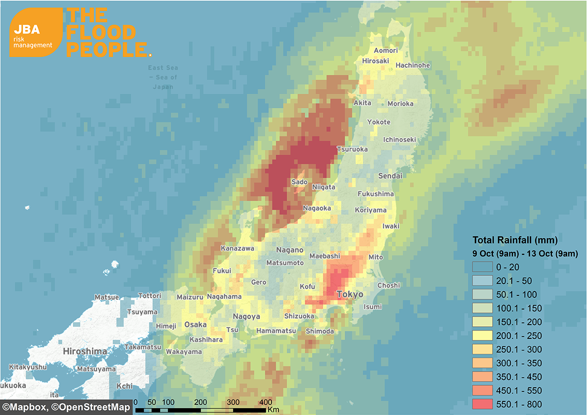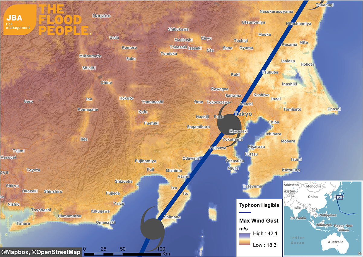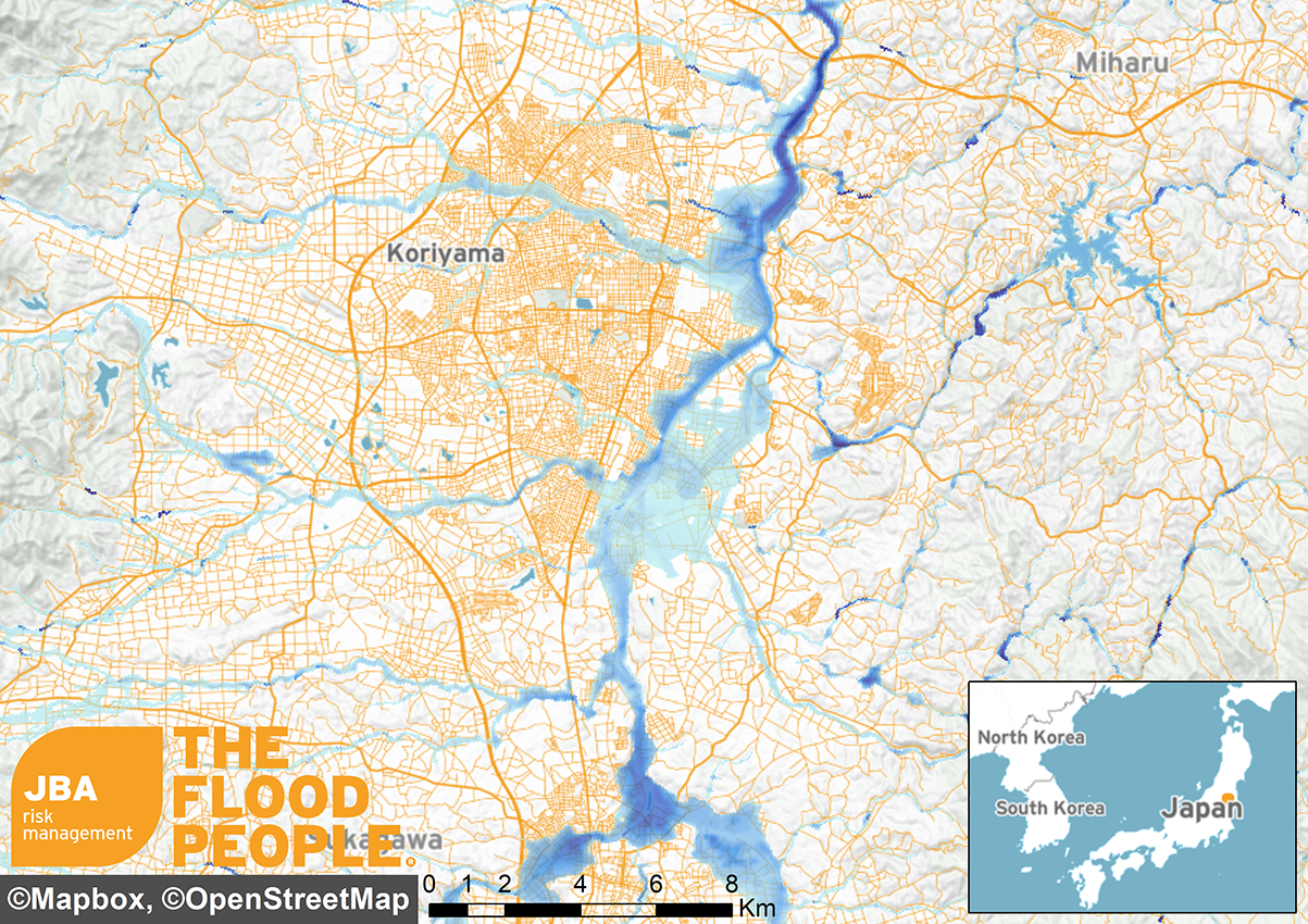 JBA Risk Management has nationwide return period flood maps and a flood model for Japan at 30m resolution. We have also produced an updated flood footprint for the typhoon, estimating extents and depths from river flooding.