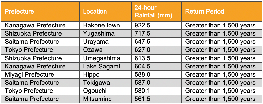 Record-breaking rainfall also occurred in the town of Hakone, with more than a metre (3ft) of rain falling in 48 hours, the highest total ever recorded in Japan in that timeframe (BBC News, 2019a). Several other areas received 30% to 40% of the average annual rainfall in just 48 hours (Watchers, 2019).