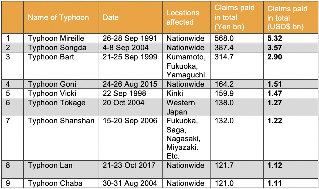 The typhoon may be Japan’s second-costliest storm and insurance claims may reach $5 billion to $10 billion, although it is too early to tell at the time of writing (Bloomberg, 2019).