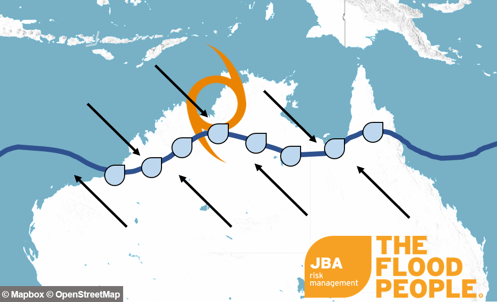 What makes this event so unusual is the interaction between Ex-Tropical Cyclone Ellie and the monsoon. Usually once a cyclone makes landfall, the system rapidly weakens as its supply of moisture from below is removed. In this case however, Ellie’s storm system became embedded within the monsoon trough (an elongated region of low pressure), which acted to offset the weakening effects of the cyclone making landfall. The interaction between the two weather systems resulted in an unusually long period of unsettled weather, catching local residents off-guard.
