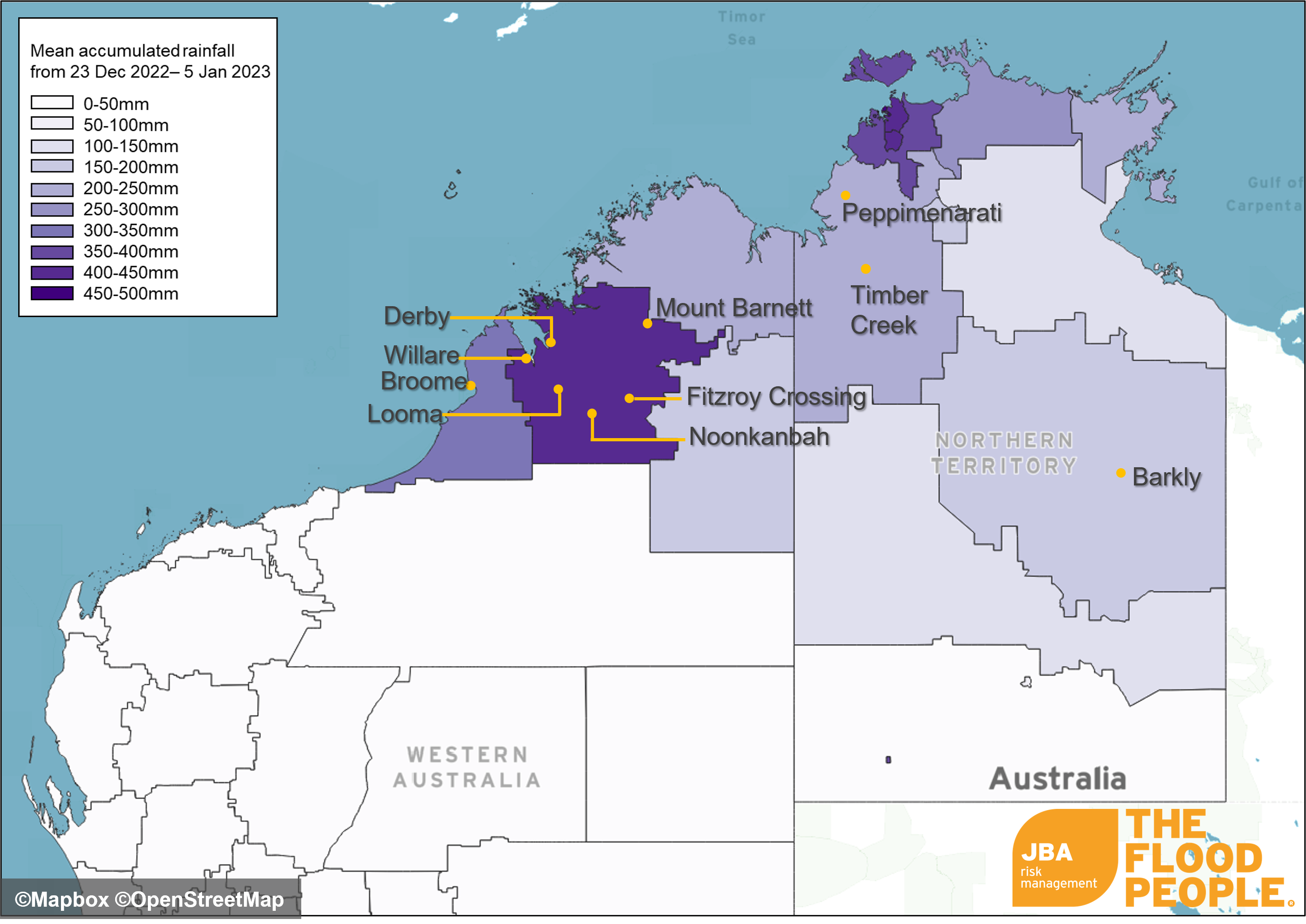 Figure 3: Average accumulated rainfall across parts of northern Australia between 23 December 2022 and 5 January 2023. Map uses publicly licensed rainfall data from the Bureau of Meteorology (9).