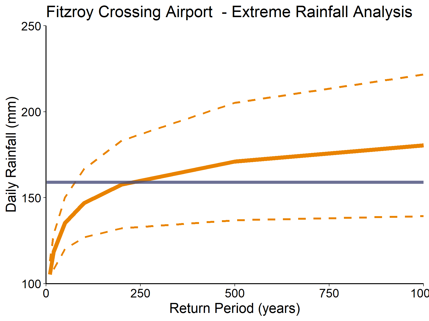 Figure 4: Estimated extreme rainfall return periods at Fitzroy Crossing based on daily rainfall totals from NOAA CPC gridded climate data. Observed 24-hour rainfall total (recorded between 02:00 to 02:00 AWST 01-02 January) is shown in context by the blue horizontal line (29)
