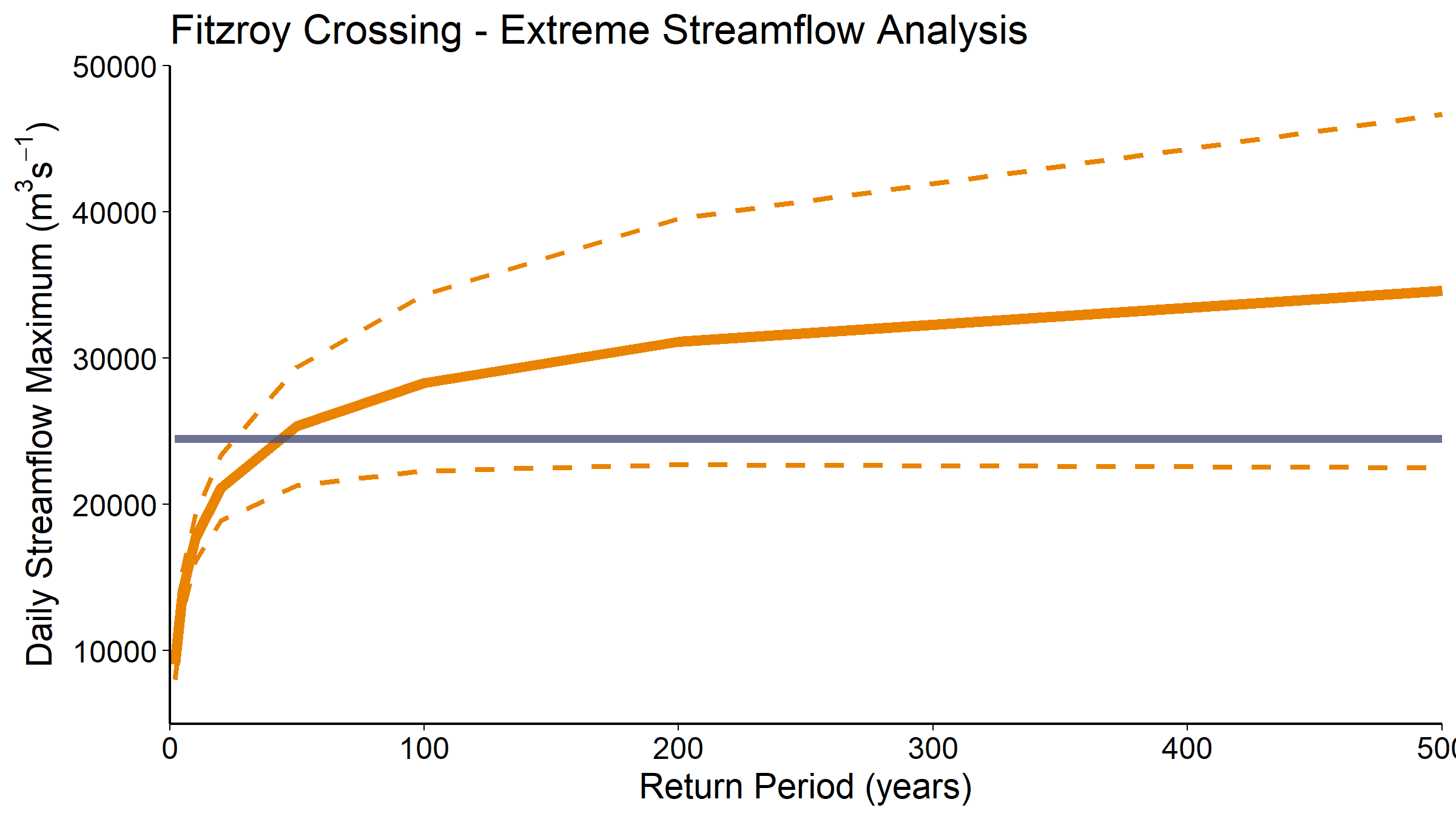 Figure 5: Estimated extreme streamflow return periods at Fitzroy Crossing (station 802055) based on daily maximum watercourse discharge data from 1957-2023. Observation (blue line) recorded on 02 January 2023.