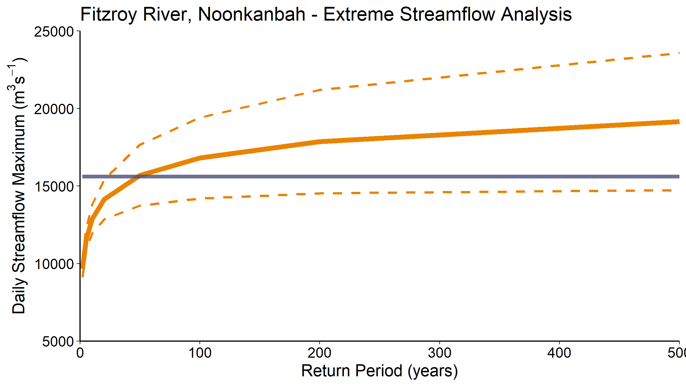 Figure 6: Estimated extreme streamflow return periods at Noonkanbah (station 802006) based on daily maximum watercourse discharge data from 1997-2023. Observation (blue line) recorded on 05 January 2023.
