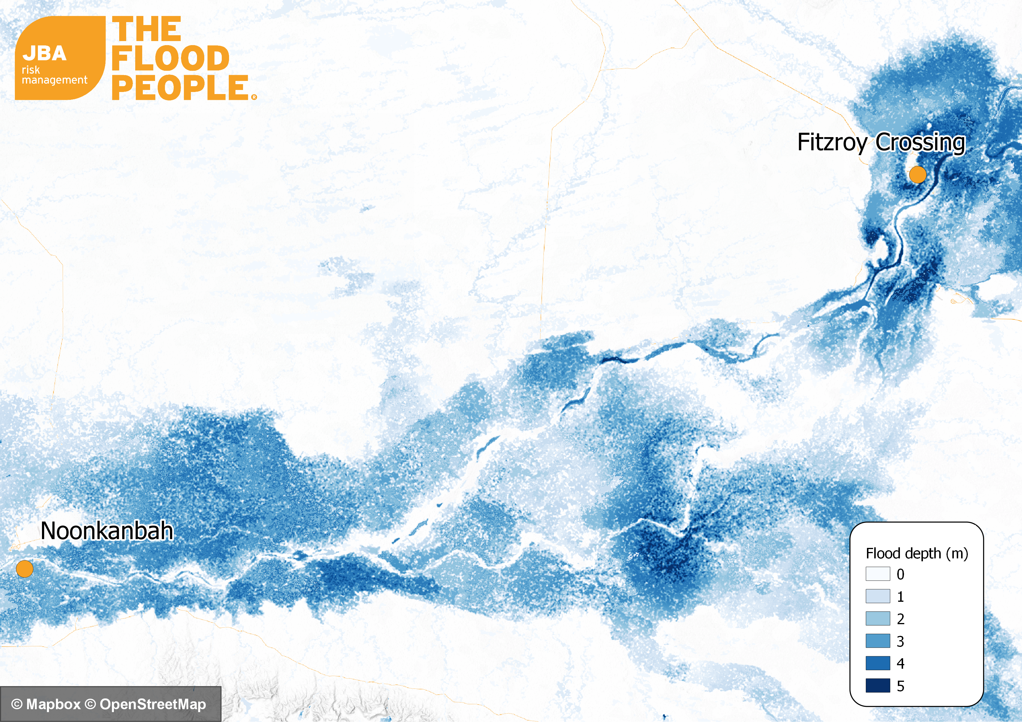 Figure 7: JBA’s 50-year return period river flood map showing depth and extent of flooding along a section of the Fitzroy River between Fitzroy Crossing and Noonkanbah.