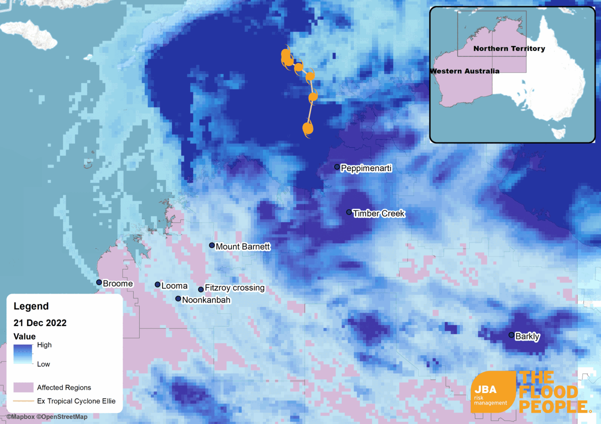 Ellie first formed as a tropical disturbance on December 20 at 18:00 UTC over the Timor Sea. Over the course of the next two days Ellie intensified into a Category 1 Tropical Cyclone, finally making landfall at 11pm local time on December 22 close to the Daly River (southwest of Darwin), bringing strong winds and heavy rain across parts of WA and the Northern Territory (NT). A few hours later, Ellie began to weaken slightly and was downgraded to a Tropical Low (Depression). During the final days of 2022, the ex-tropical cyclone travelled west across the Kimberley coastline in WA and became mostly stationary throughout the first week of January, dumping continuous quantities of rain over the area. The weather system crossed east into the NT through 7-8 January 2023, before finally clearing south-east.